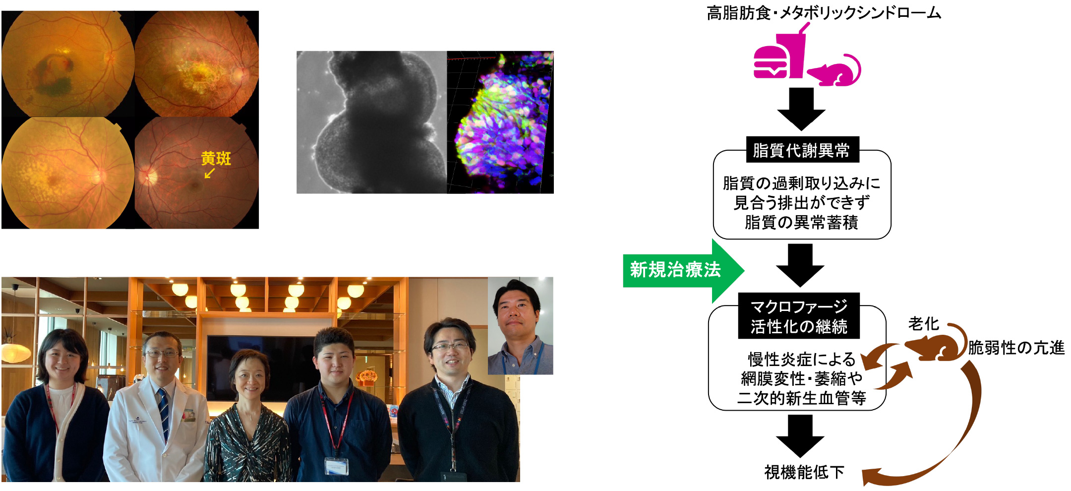 これまで我々の研究室では、AMDの基盤にある慢性炎症には高脂肪食によるマクロファージの病的活性化が鍵となること、その背景には脂質代謝異常が関係することを明らかにしました (Nagai, Okano, Ozawa et al. Communications Biology 2020)。ヒトにおけるAMD発症のリスク因子には、喫煙の他に高脂肪食や肥満を始めとするメタボリックシンドローム、脂質代謝に関連する遺伝子の変化などがあることからも、脂質代謝の制御は重要といえます。その一つの方法として、同論文で我々はこれまでにマウスにおいて、アンジオテンシンⅡ 1型受容体抗剤 (angiotensin II type1 receptor blocker; ARB)の継続投与による脂質代謝制御の方法を報告しました。現在はその効果のメカニズムをさらに解明すると共に、さらなる病態メカニズムと新規治療アプローチを探索しています。